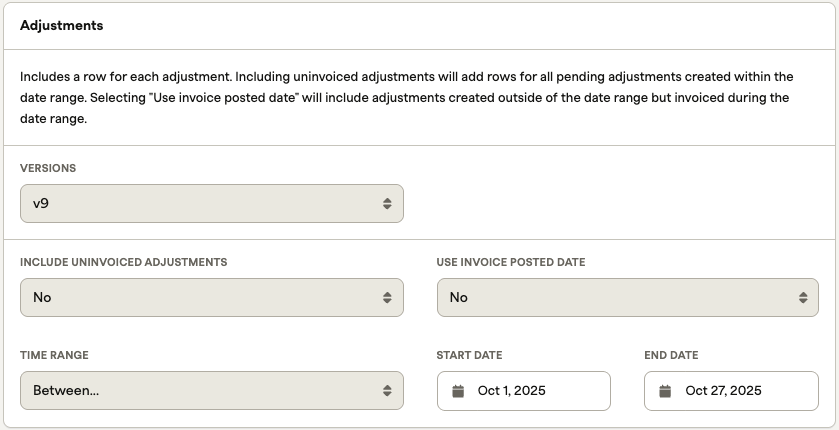 - Ordinarily, the export utilizes the adjustment's creation date rather than the invoice date. Consequently, an older uninvoiced charge or credit that was created within a set date range but invoiced later will not be reflected in the export. To counter this, choose this option to instead use the invoice posted date for a comprehensive view. Note that the creation date determines the presence of uninvoiced adjustments in the export as they lack an associated invoice date.