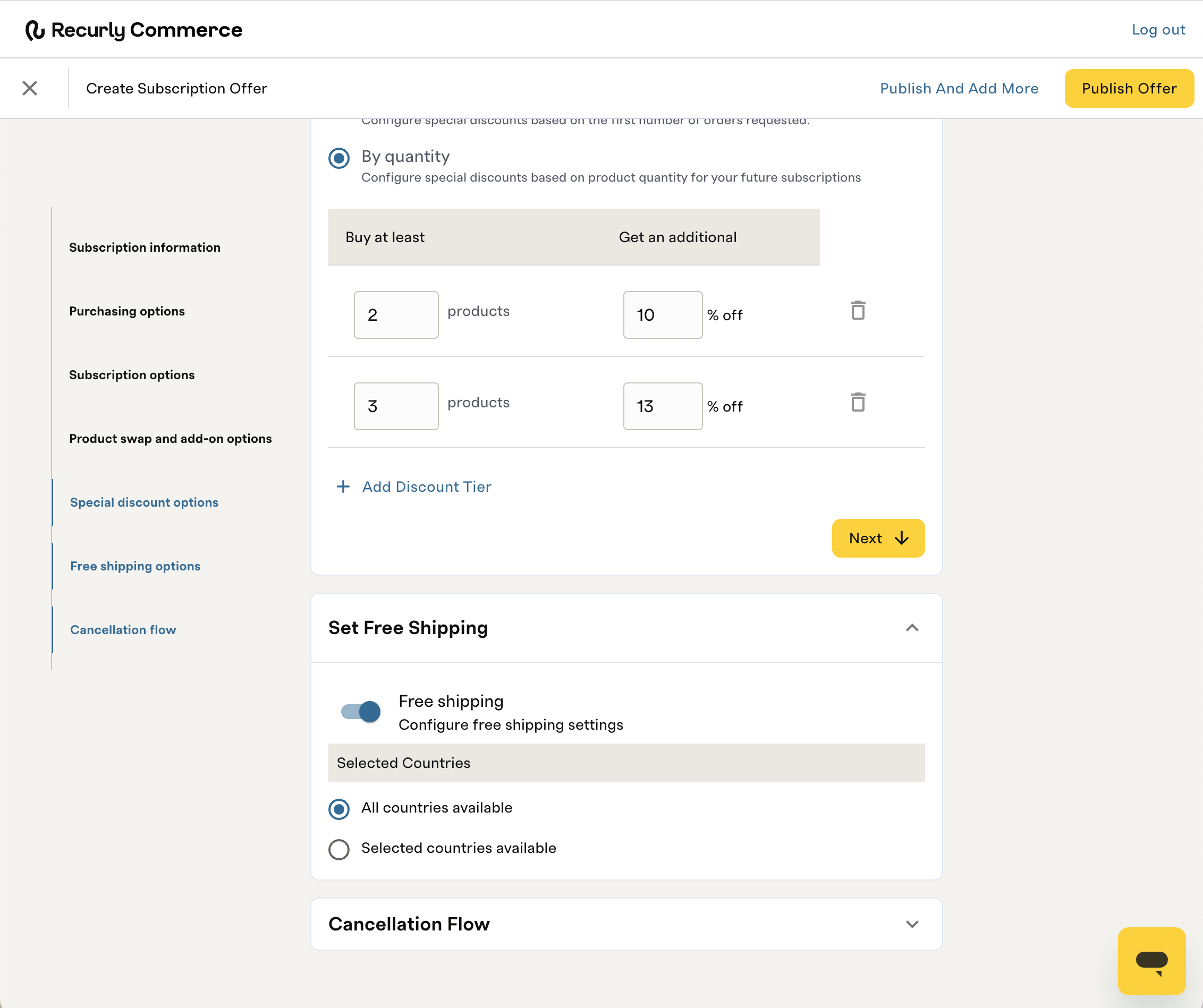 - Flexible pricing & discounts: Configure one-time, subscription-only, prepaid, or hybrid offers with tiered discounts and special promotions.
