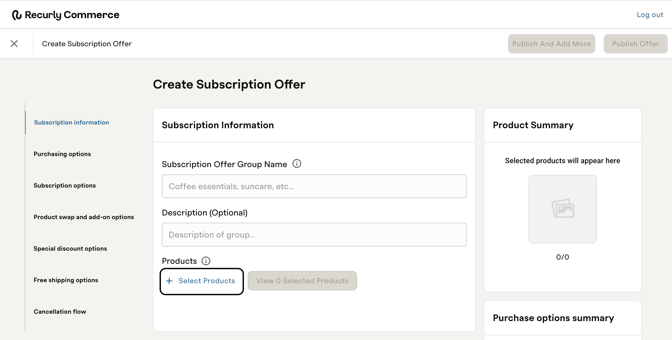 Note: Only products that do not currently have a subscription offer are available for selection.