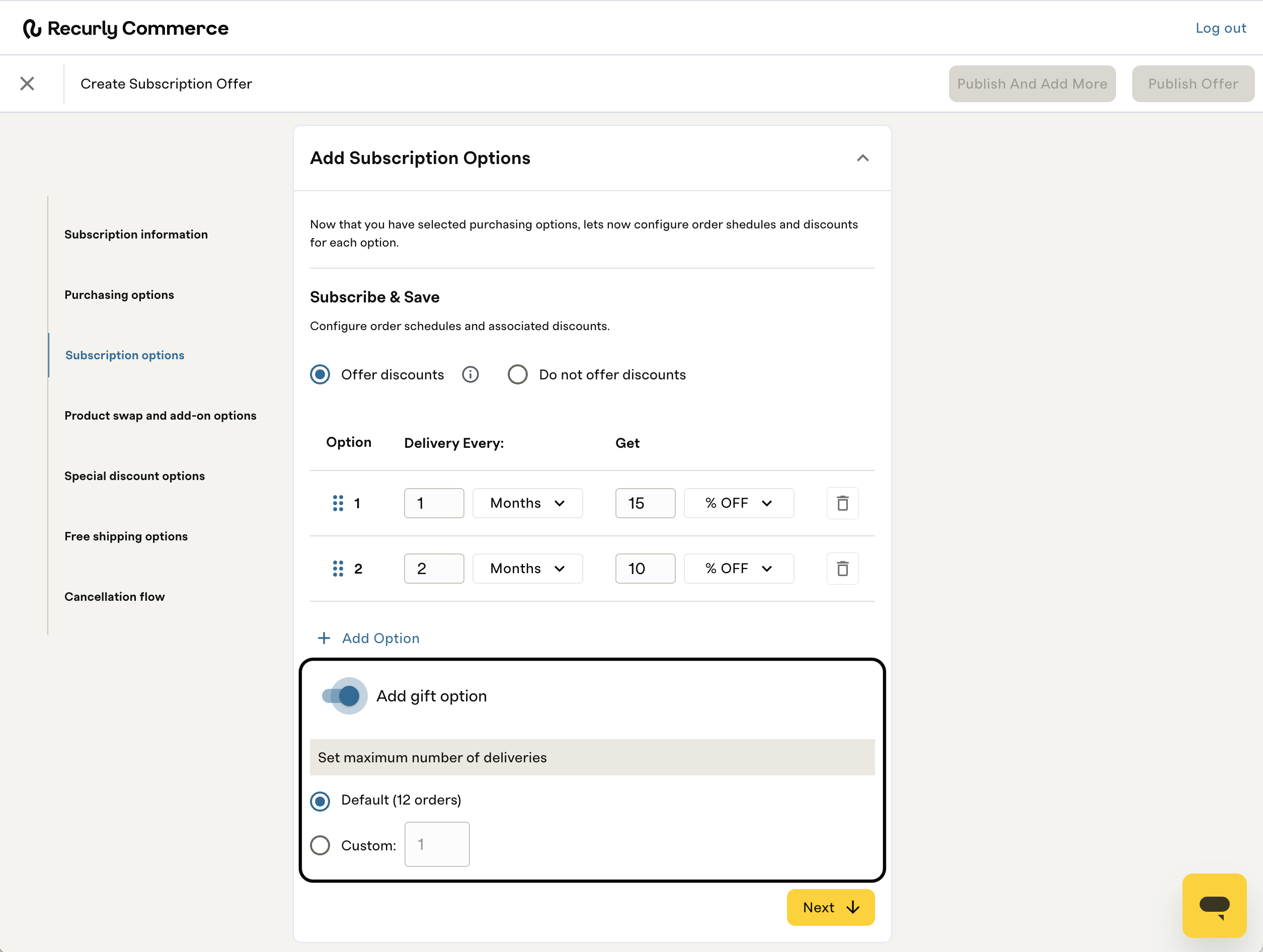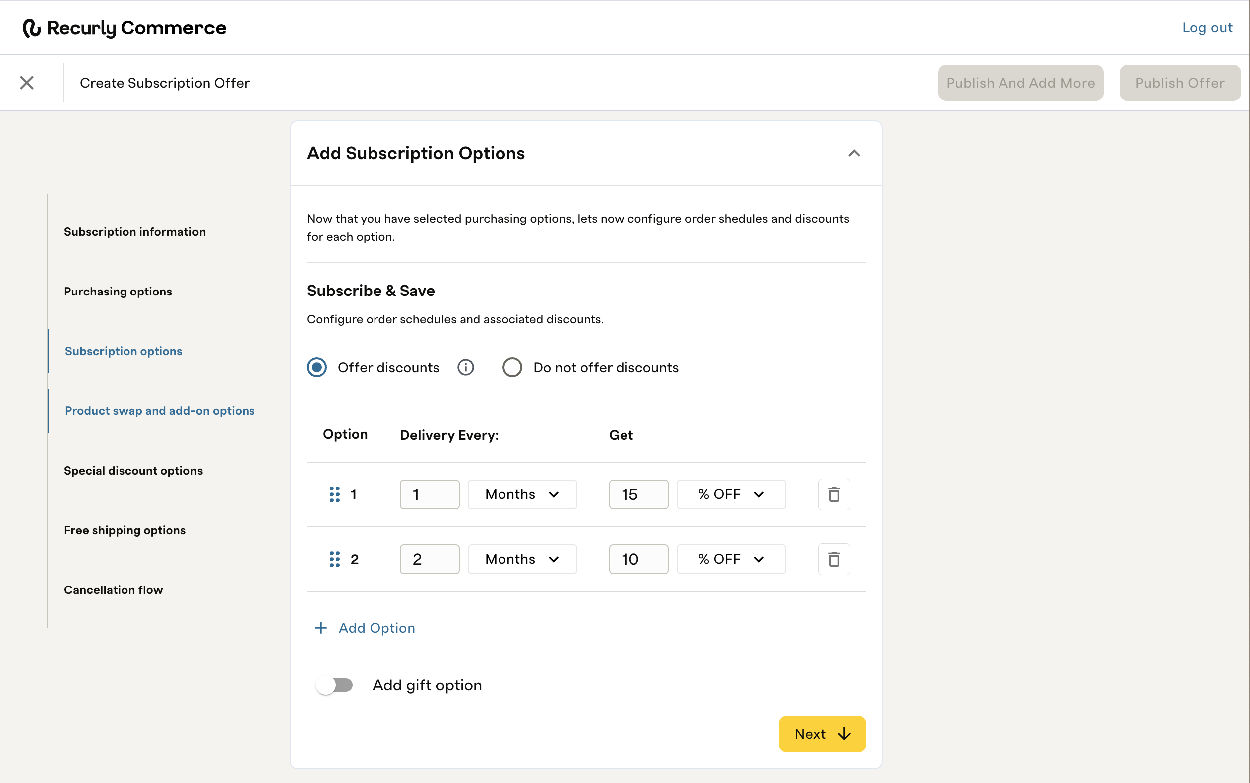 - Click + Add Option to define each delivery frequency (e.g., every 1 month, every 2 months).