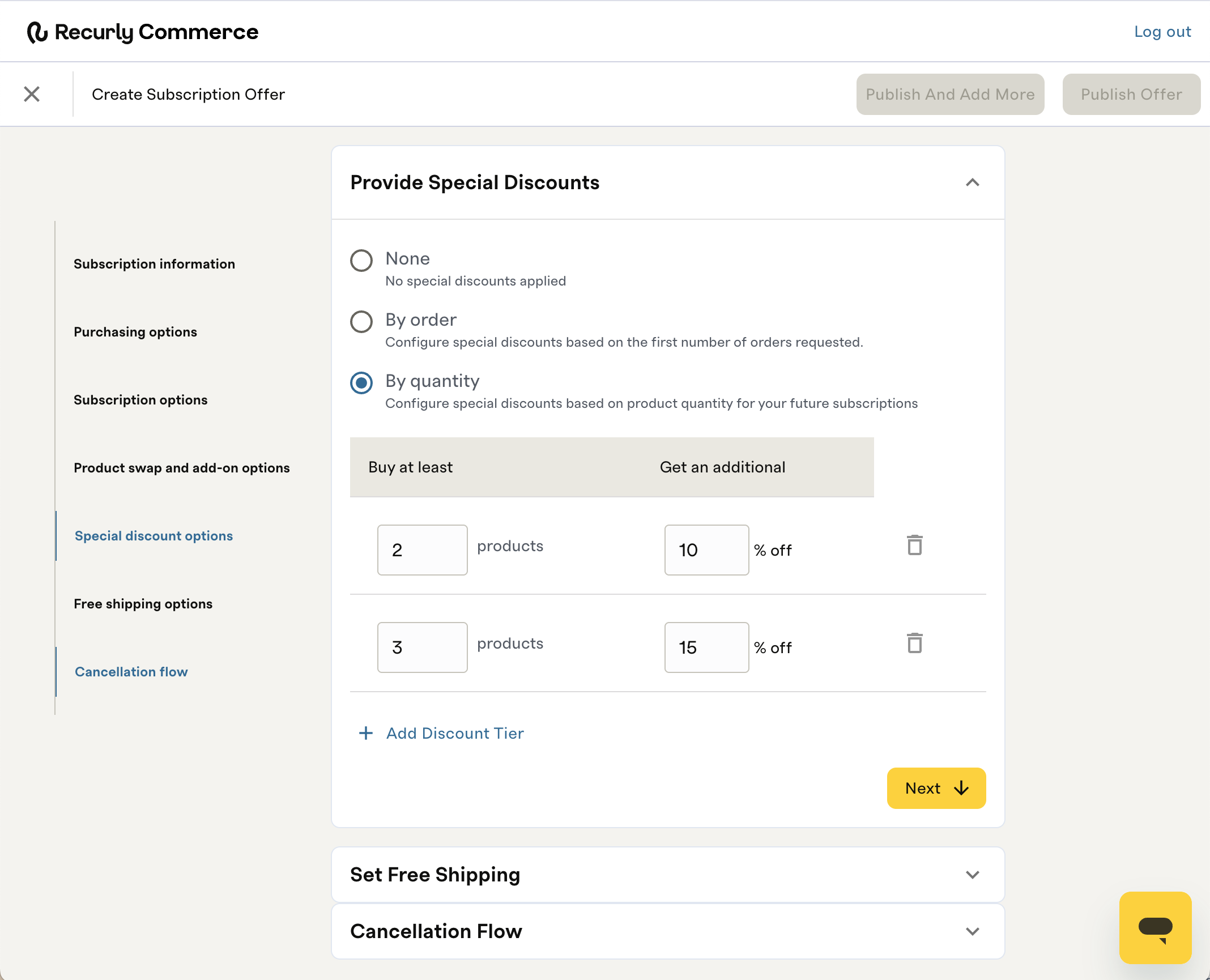 Note: Discounts don’t stack. Special discounts override the recurring frequency discount until they expire—for example, a “first 3 orders 50% off” runs first, then the “10% off every 1 month” takes over.