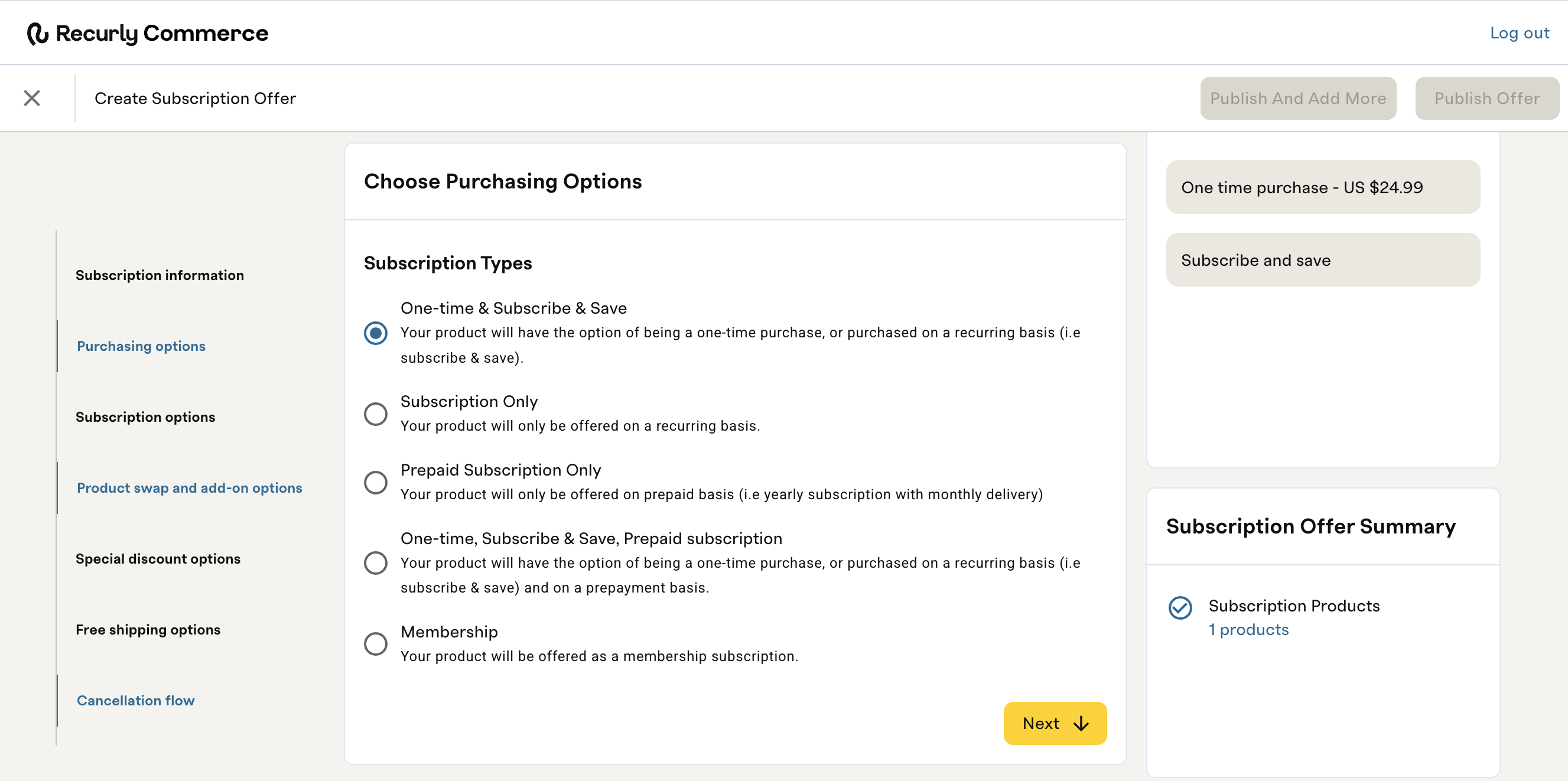 When you’re satisfied with your selections, click Publish Offer in the top-right corner. Your subscription plan is now live on the product pages you configured.