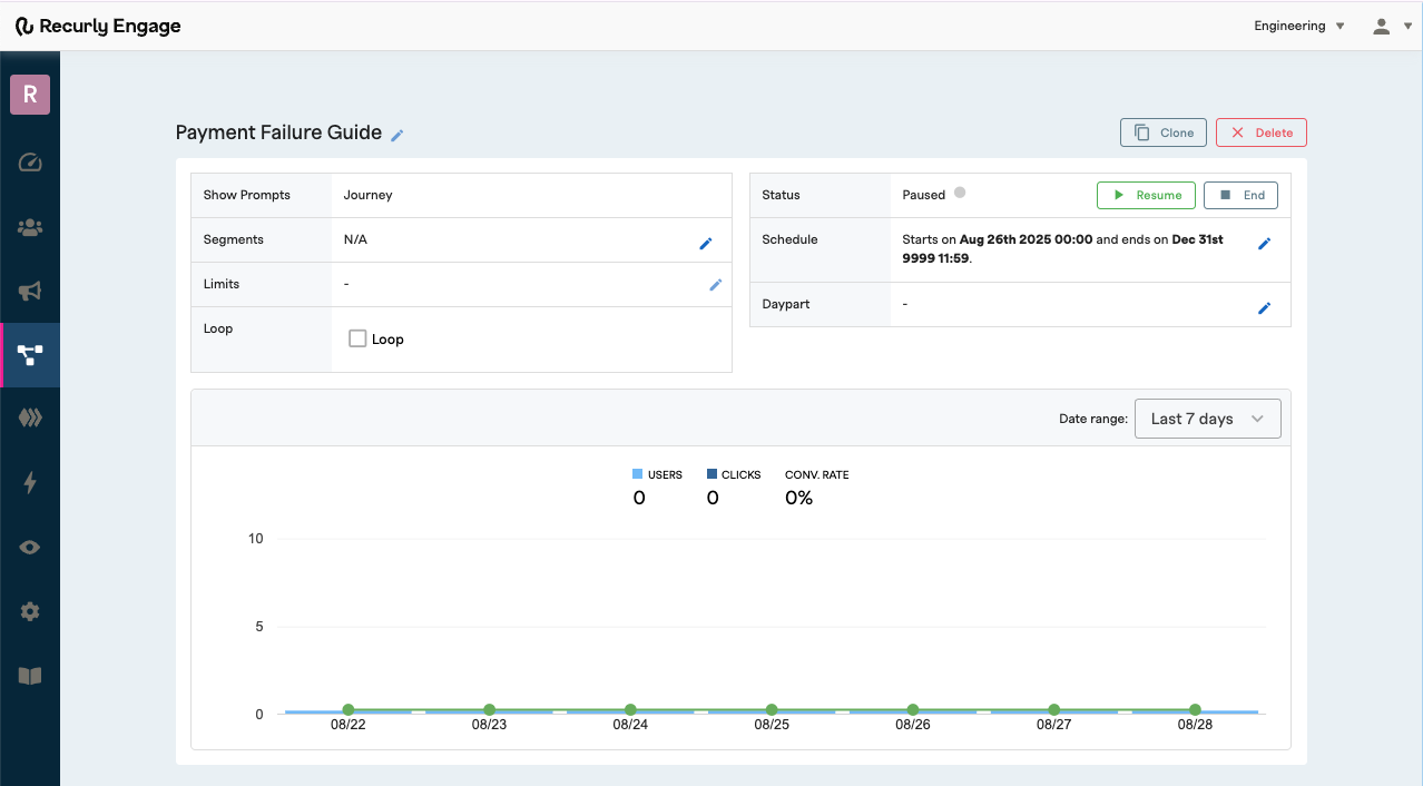 Payment failures are a common issue for subscription businesses, often leading to involuntary churn. This guide will walk you through setting up a customer journey that gently prompts users to update their payment information, helping you recover failed charges and retain subscribers.