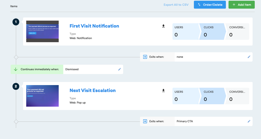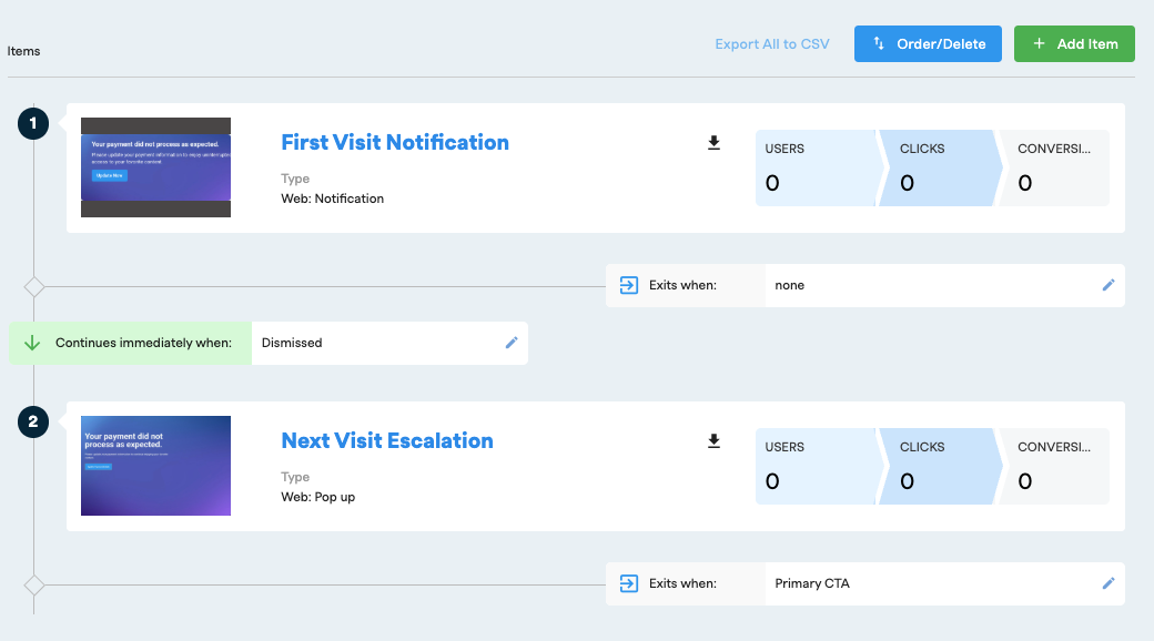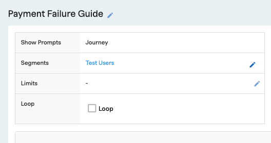 For users to view the second step in the Payment Failure Guide, they must first interact with Step 1. Therefore, remember to set up a Trigger for each Prompt within the guide.