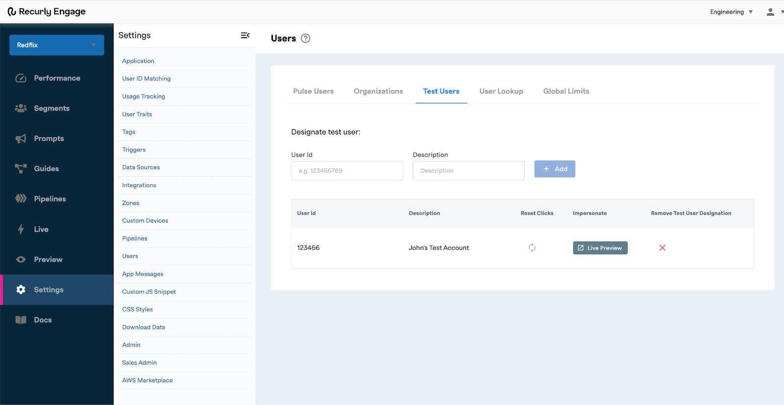 - You can test the flows on Live by adding your own user ID to the Test Users segment under Settings > Users > Test Users
