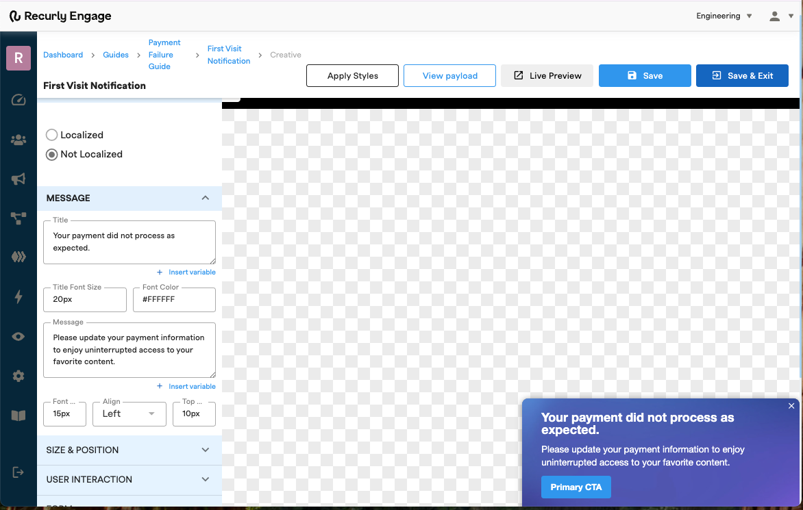 Recurly Engage provides an additional tool to reduce involuntary churn by using a guide to prompt the user—over one or more visits—to update their payment information.