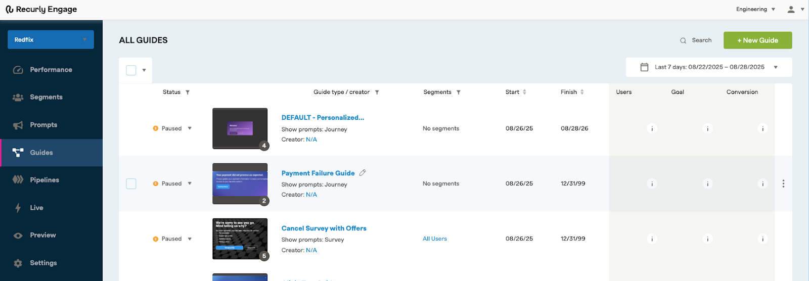 Access the Recurly Engage Management console, known as Pulse, via Login. This console serves as a central interface for configuring applications, user traits, segments, prompts, guides, and integrations.