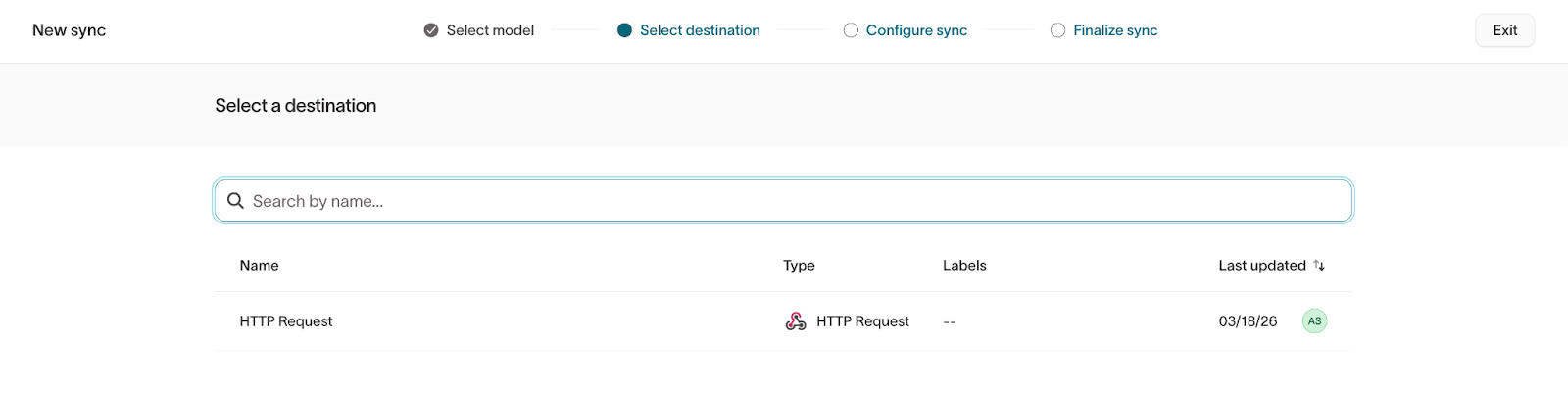 Navigate to the Syncs page and click Add Sync. Select the Model containing the user data you wish to move into Recurly Engage.
