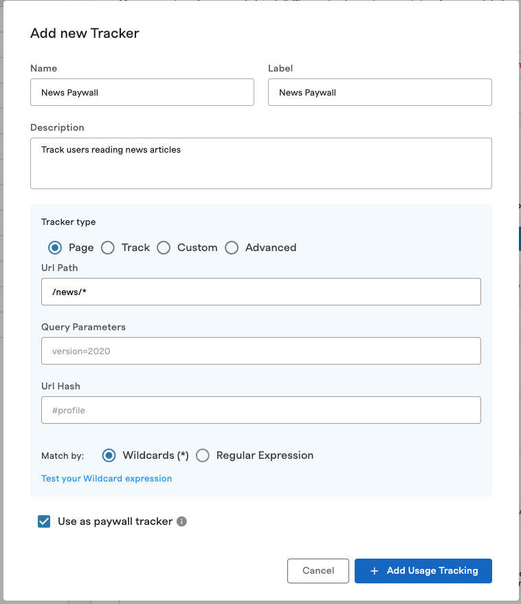 - Fill out the required fields for Name, Label, Description. Select the Page tracker type, enter the relevant url path. Adding an * after the last backslash will enable tracking for any url path after the entered input.