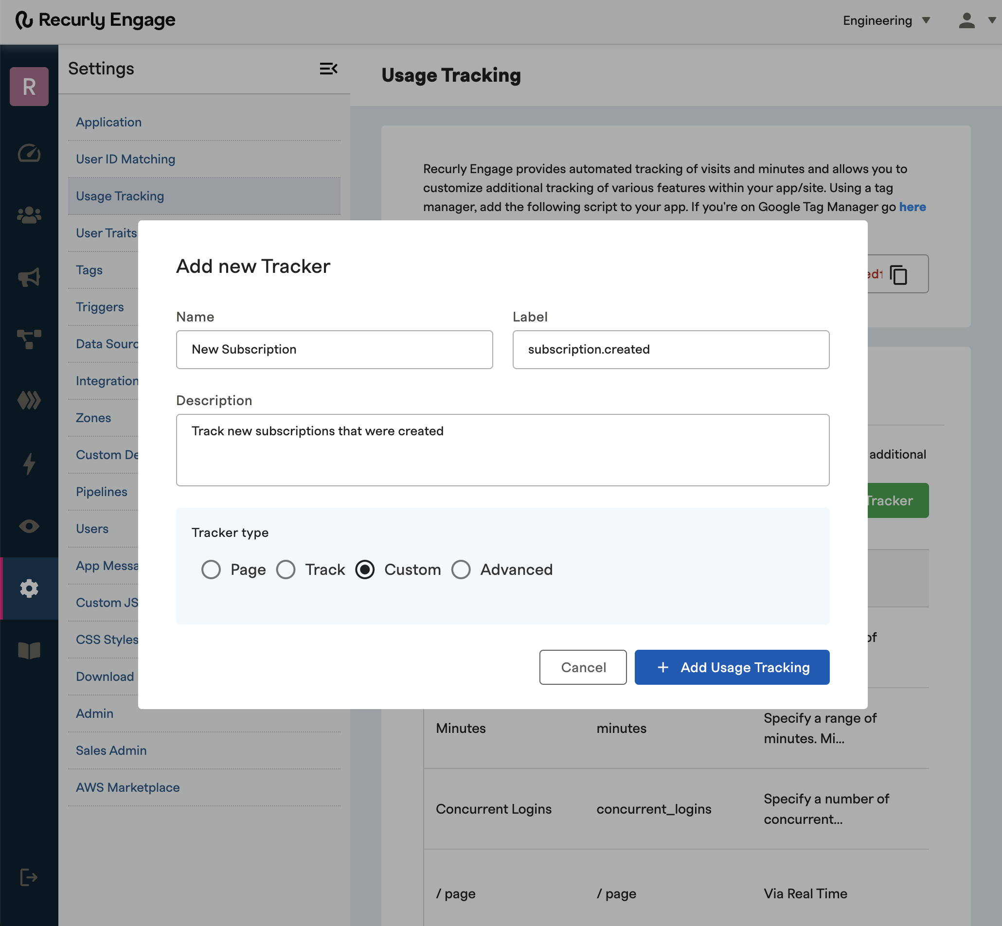 - Create a new Custom Tracker by adding the name, label (be sure to match the Recurly Webhook Payload), and description of the tracker. Ensure the tracker type is set to "Custom"