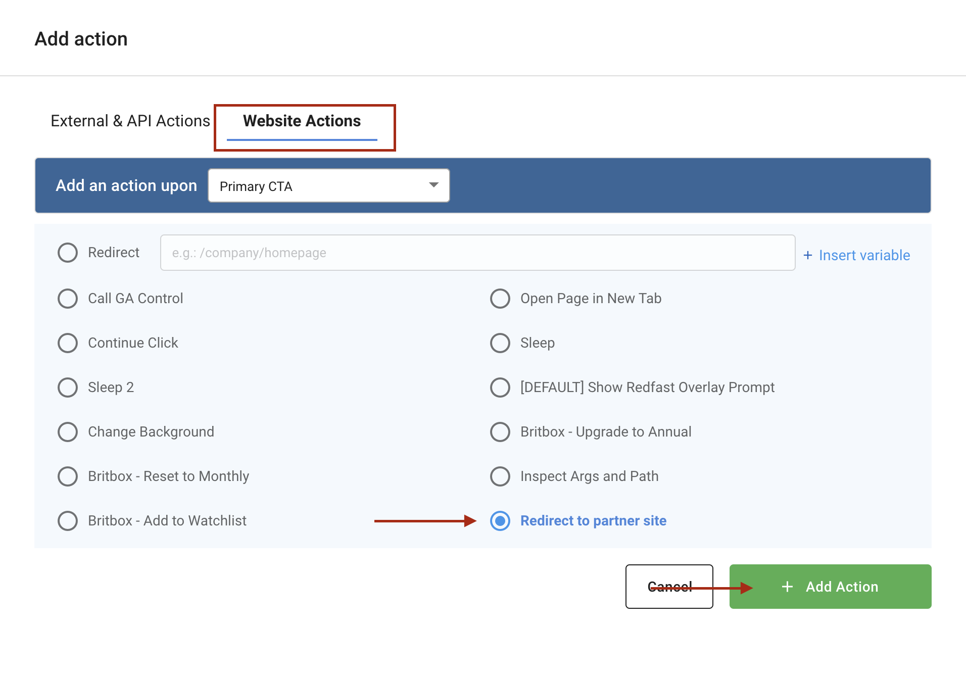 - Add the website action