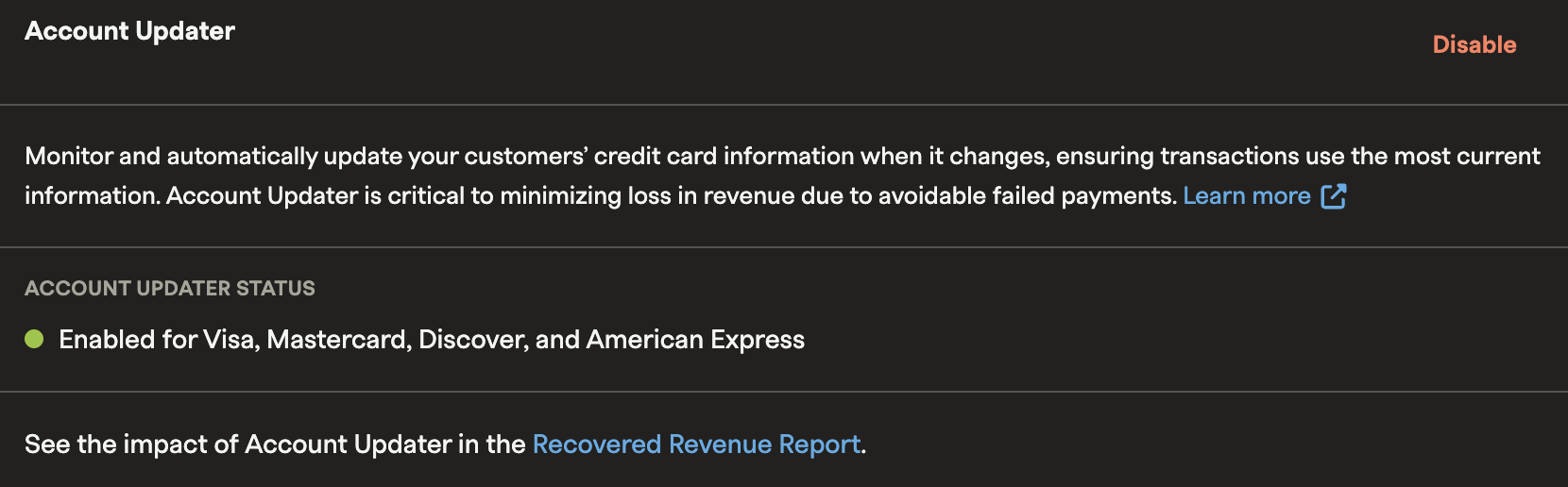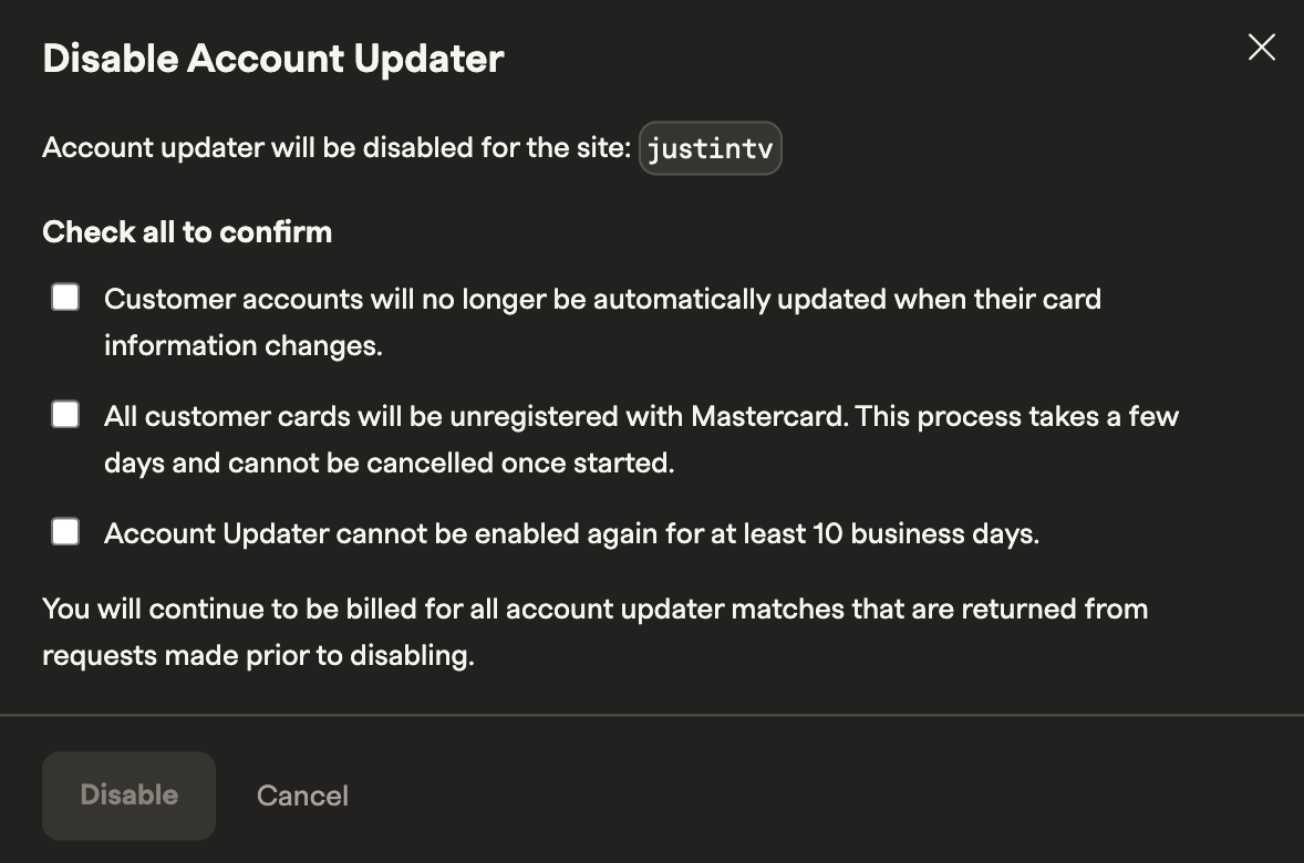Warning: If you disable Account Updater, you cannot re-enable it for 10 business days.