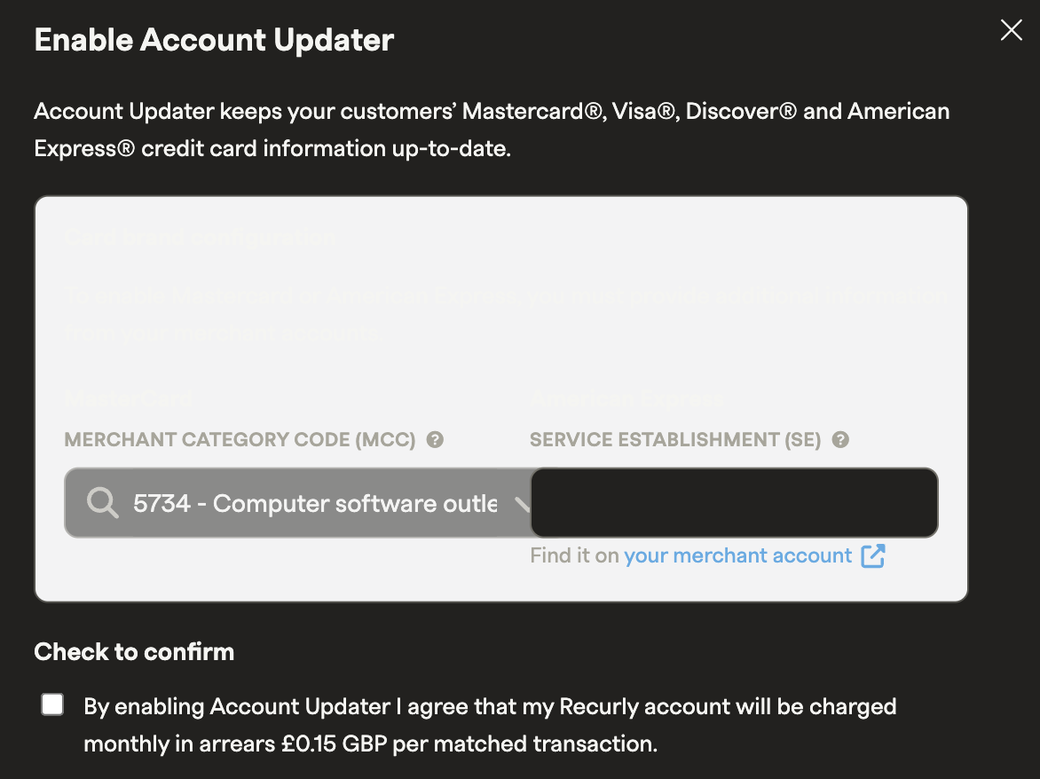 - Account Updater must be activated on the Payments Settings page in Recurly