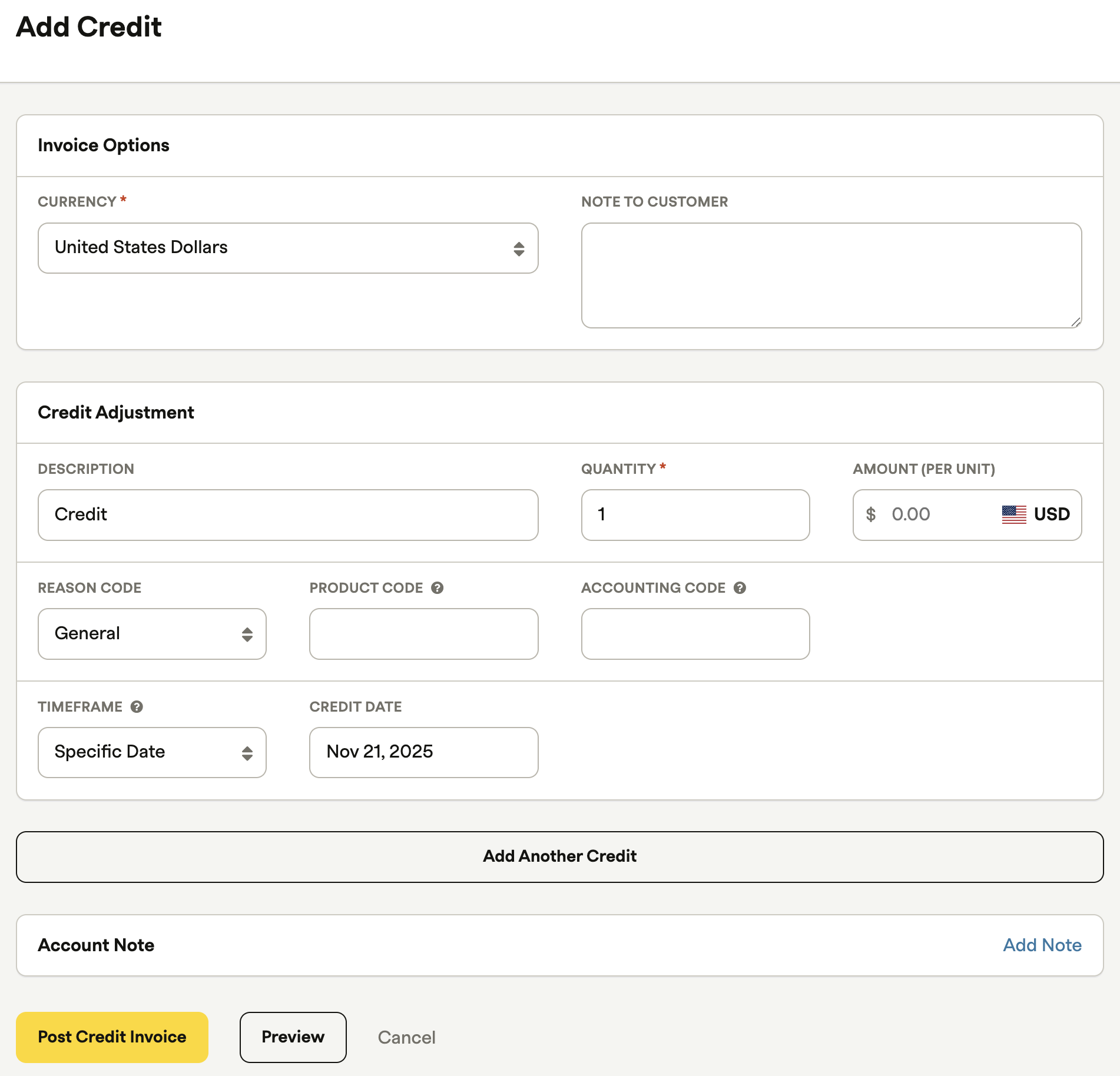 When issuing a credit, you have full control over the amount of the credit, the currency it is issued in, and how it is described on the customer’s invoice. This allows you to use credits in a flexible way that matches your business needs.