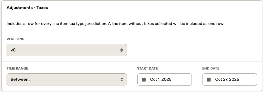 The Adjustments - Taxes export is designed for reporting on taxes calculated through Vertex. It is pertinent to note that for reporting on taxes calculated through Avalara, you should utilize the Adjustments export. This CSV file contains a row for each tax jurisdiction that is returned for a line item. Even line items without taxes will be included but as a single row in the export.
