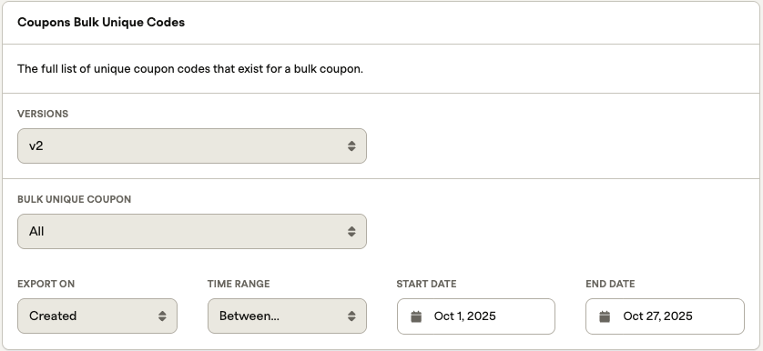 Coupons — bulk unique codes - export