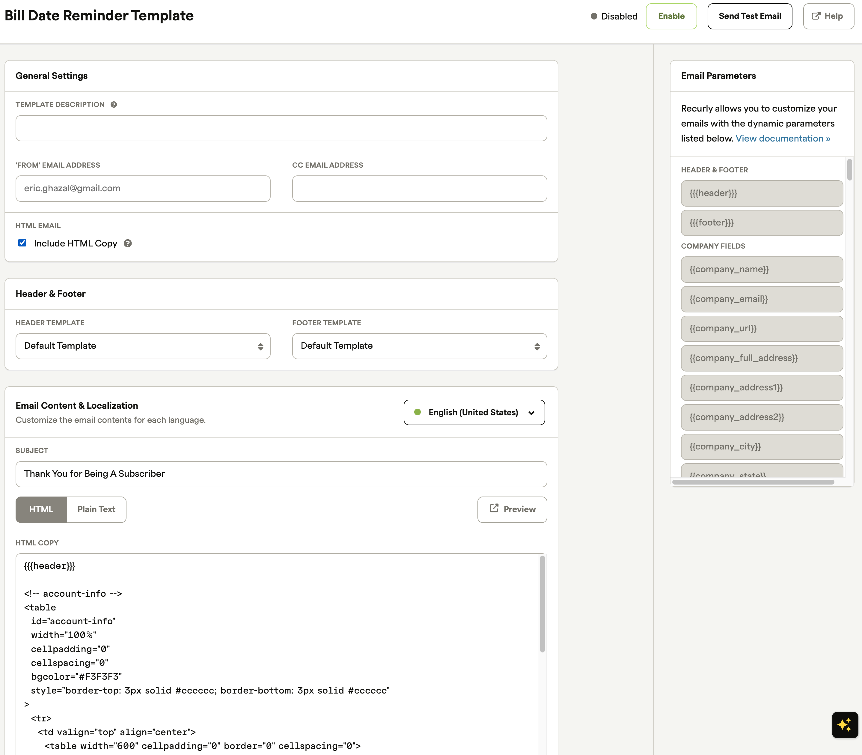 Recurly automatically sends out plain text and HTML versions of your emails. Users will see the HTML version if their mail client supports it; otherwise, they’ll see the plain text version. Feel free to customize both versions to match your style. If you prefer, you can disable the HTML version for each email type.