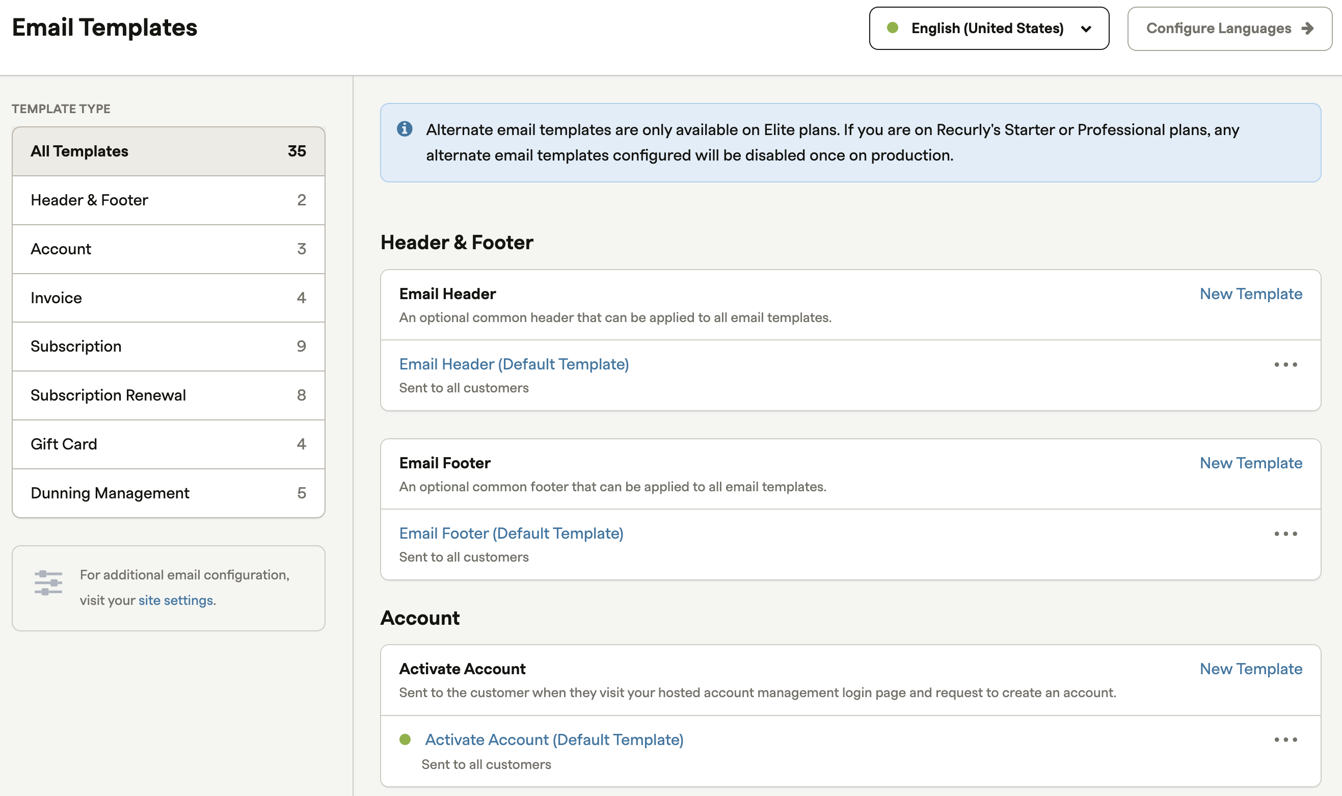 Recurly offers email notifications for various actions. Please note that notifications are only sent to valid email addresses; addresses ending with "@test.com" or "@example.com" are deemed invalid. In the absence of a valid email linked to an account, notifications will be sent to the site's billing contact. By default, all email templates are in English, unless modified.