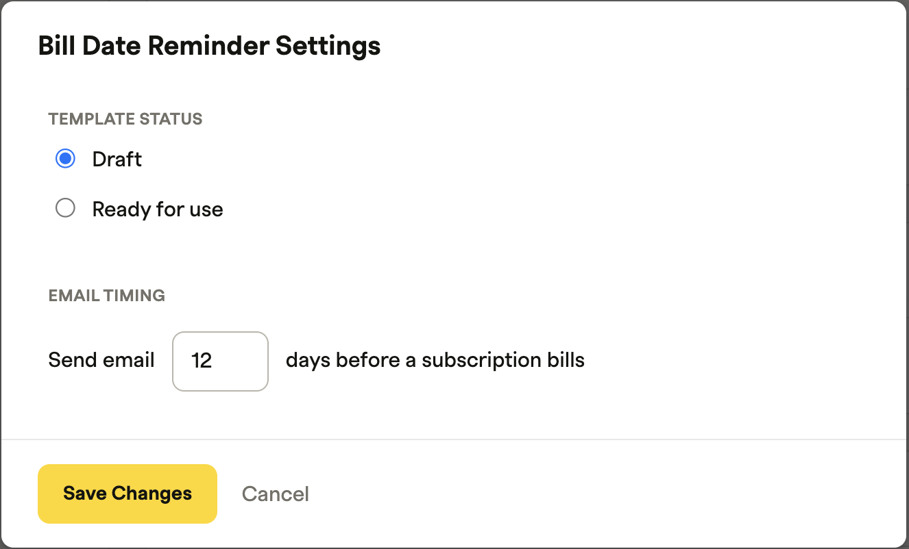- Pause Reminder: Sent to a customer [n] days prior to remind them of their upcoming subscription pause. The default number of days is 7 and this can be configured in the email template settings.