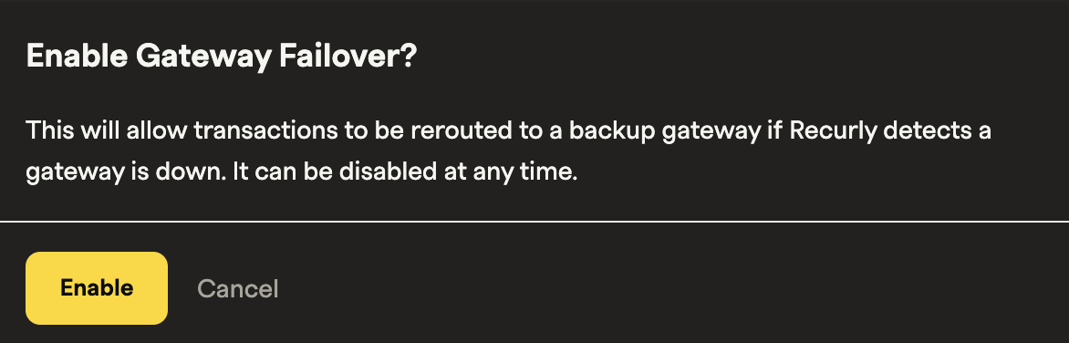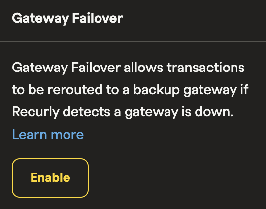 - Merchants will be able to enable Gateway Failover from their gateway configuration page, by designating a primary and backup gateway for each credit card type and currency. Recurly will default to the first gateway added or set default gateway for the specific card type and currency. Gateway(s) added to the site after will then be used for failover scenarios (prioritizing the earlier addition(s) first).