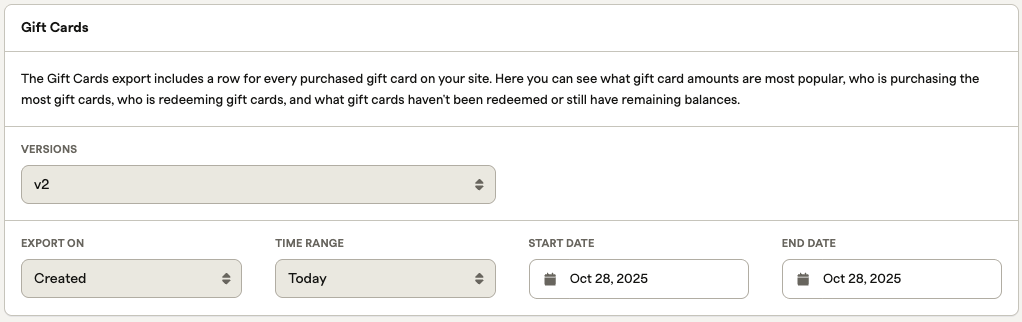 - Created - shows all gift cards purchased during the selected time range. Uses the "created_at" field from this export.