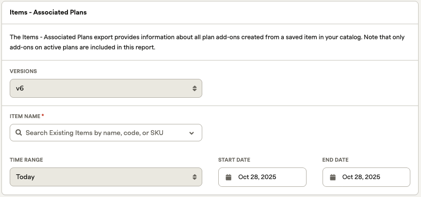 The "Items - Associated Plans" export function in Recurly permits users to generate a report containing detailed information on all plan add-ons created from a saved item in your catalog during a specified period. It focuses exclusively on add-ons that are presently linked to active plans, ensuring that your report only contains the most pertinent and up-to-date data.