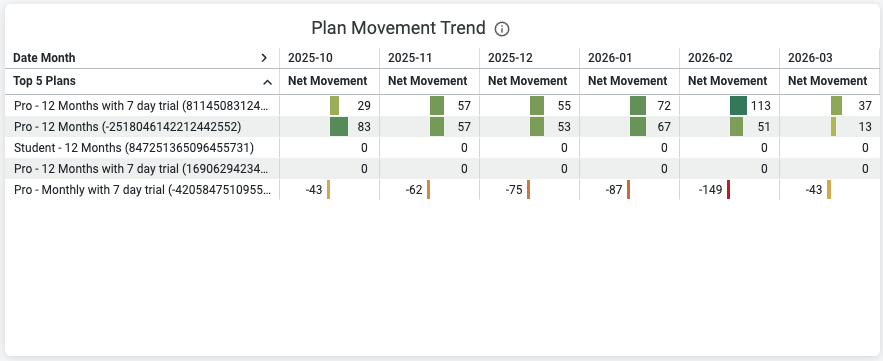 Movement by Plan shows whether their subscription plans are gaining or losing subscribers over time.