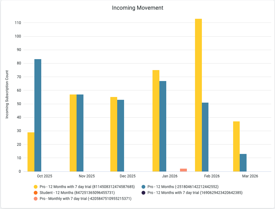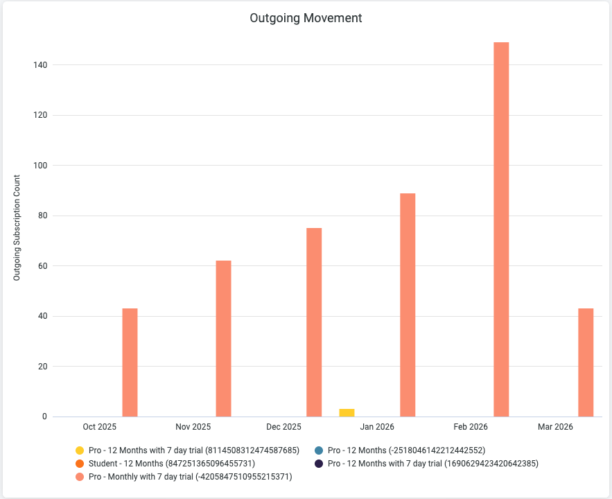 - Plan-specific insights: See incoming and outgoing subscriber counts for each plan by month to understand which plans subscribers are moving to and from resulting from a plan change.