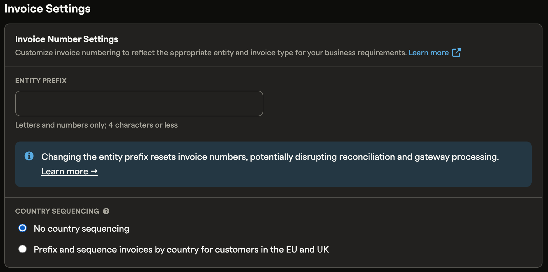 An entity prefix is an alphanumeric string of four characters or fewer that's added before the sequential invoice number. When enabled, the sequence starts at 1,000 and increments by one.