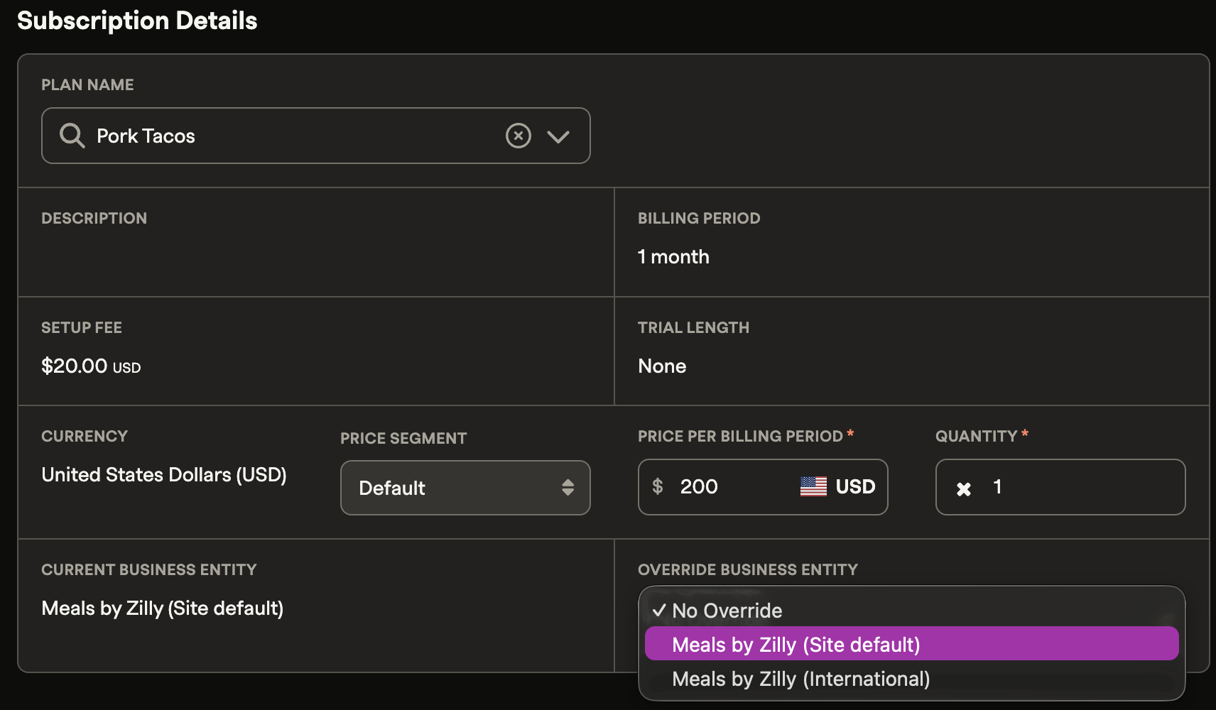 If you have multiple brands, or customers who subscribe to more than one of your entities, you can assign a business entity directly to individual subscriptions. This allows for consolidated account management across subsidiaries and entities.