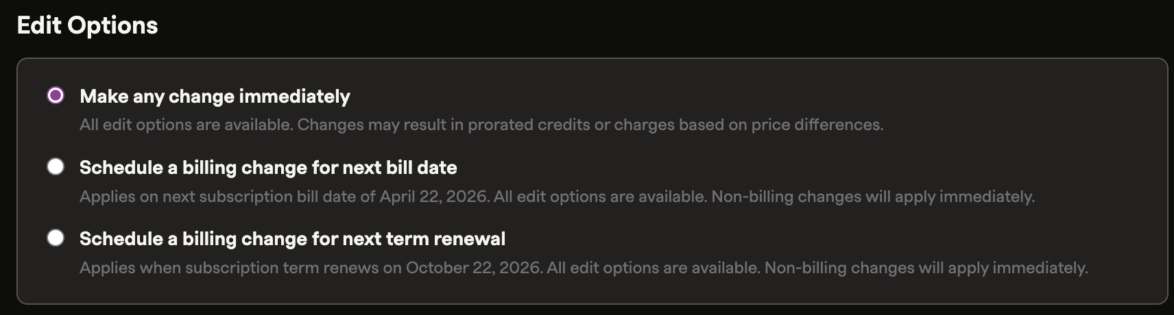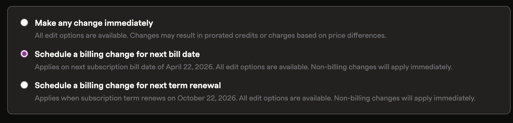 When scheduling subscription changes for the next bill date or next term renewal: