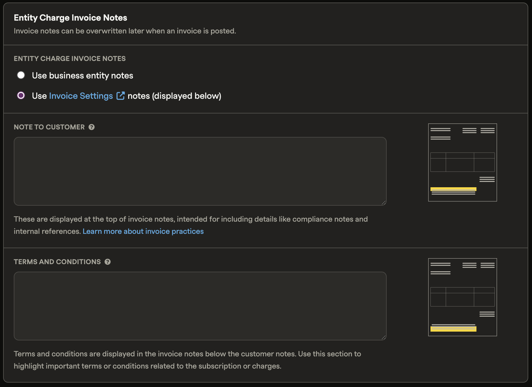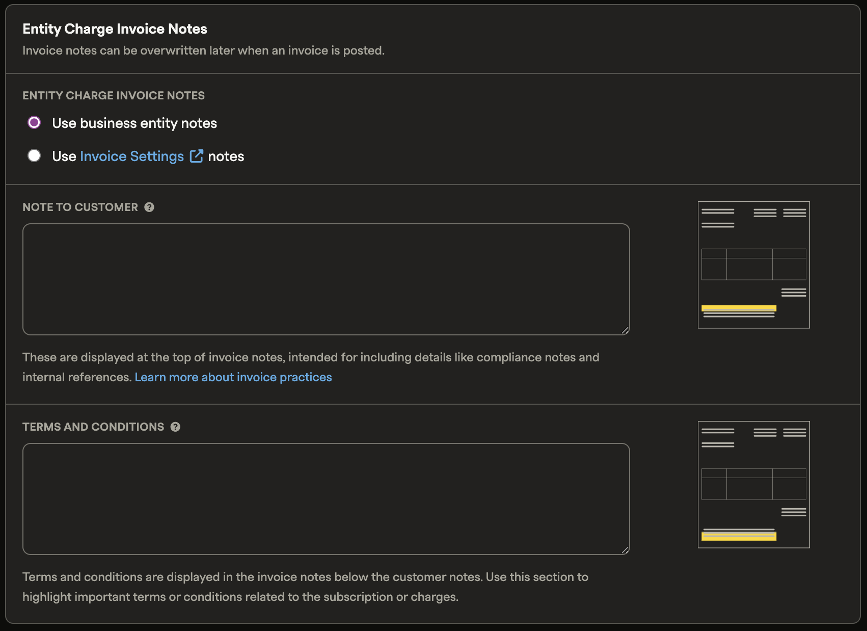 If you create a new alternate entity and there are no notes on the Invoice Settings page, entity-level notes will be selected automatically. You can switch to using Invoice Settings notes at any time.