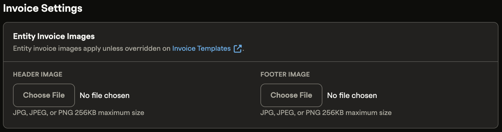 Header and footer images let you control which logos appear on invoices sent to your customers. Footer images are commonly used for secondary logos or custom messaging.