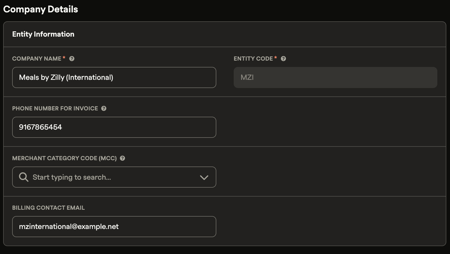 The Billing Contact Email address is used as the "from" address on all transaction emails and appears on all invoices and receipts. Keeping this accurate for each entity ensures customers always see the right contact information.