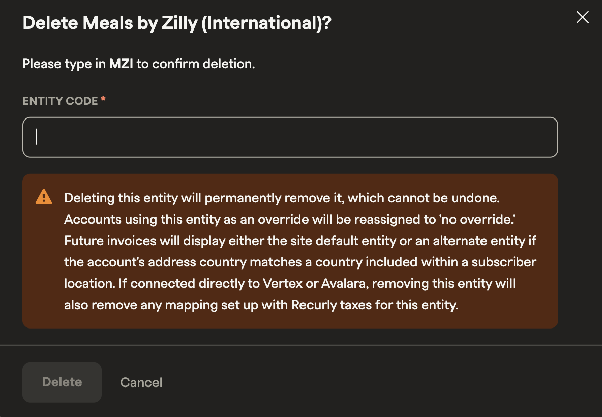 To confirm deletion, you'll be prompted to enter the entity's code. Once confirmed, the entity is permanently removed. However, any refunds tied to original transactions under that entity will still use its display and tax address information.