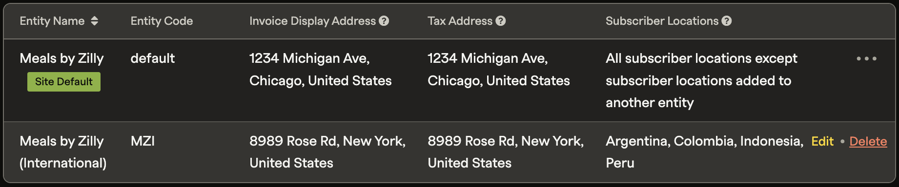 If no countries are added to any alternate entity's Subscriber Locations, all customers are automatically assigned to the Site Default Entity, which acts as the site-wide fallback.