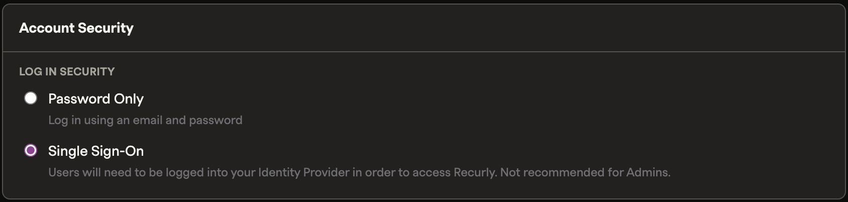 - SSO and two-factor authentication: When a user opts for SSO, they no longer have access to Recurly's two-factor authentication service. This is an important factor to consider when deciding on using the SSO feature.