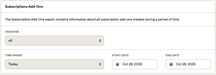 The Subscription Add-on export tool helps you to gather detailed information about all the subscription add-ons created within a specific timeframe. It is important to note that this export only includes details of the add-ons that are currently active and attached to subscriptions. Add-ons that have been removed will not feature in this export.