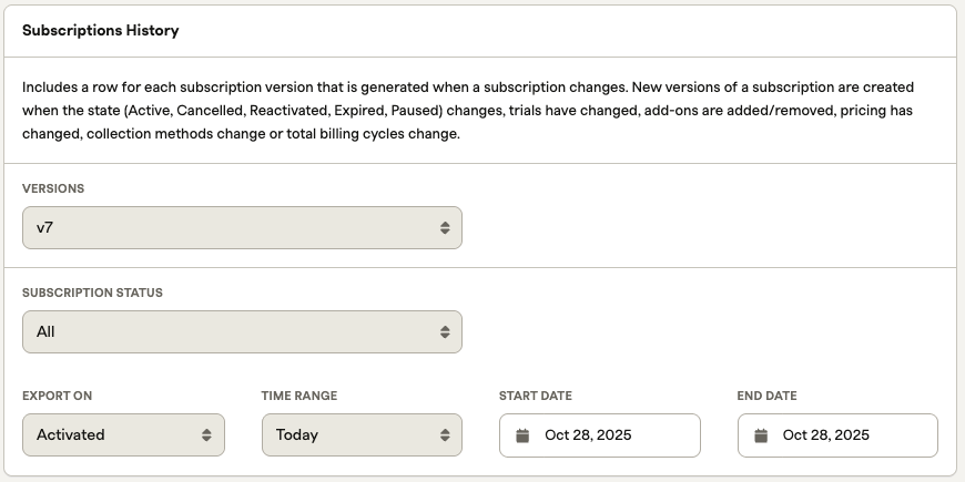 Unlock a detailed record of subscription alterations with the Subscriptions - History export.