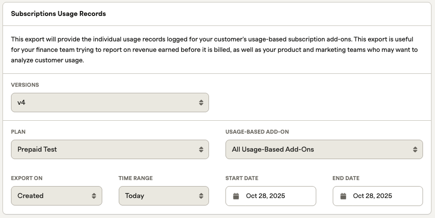 - All Usage-Based Add-Ons: Export records for all associated usage-based add-ons for a chosen plan.